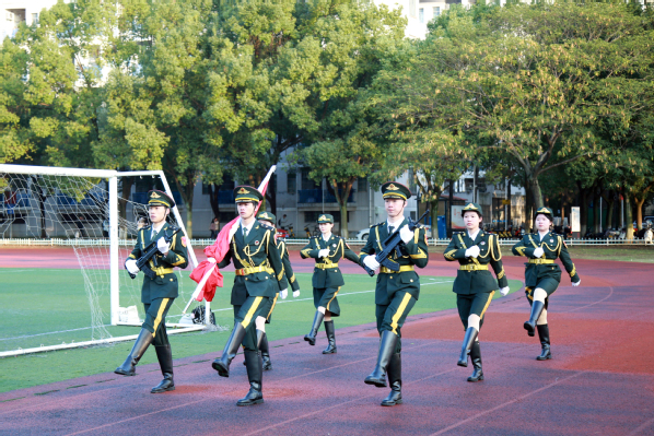 7点10分,国旗护卫队的旗手们着装整齐,迈着矫健的步伐,护着鲜艳的五星红旗入场进行升旗仪式。伴着《义勇军进行曲》的响起,全体唱国歌、行注目礼,庄严肃穆。