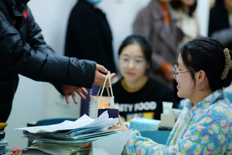 考研福袋中的每一份礼物都有着特别的暖心寓意:暖暖的奶茶驱散备考的疲惫,代表着温暖相伴;柿子和橙子寓意着心想“柿橙”(事成);定胜糕象征了一定胜利和步步高升。此外,还附有学弟学妹亲手撰写的手工贺卡,则凝聚了人文学院学生们的共同祝福与期盼。在师生交流过程中,姜杨慧关切询问了同学们的复习成果,并嘱托大家放松心态、劳逸结合,坚持到底必将一战成硕。