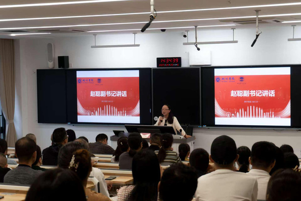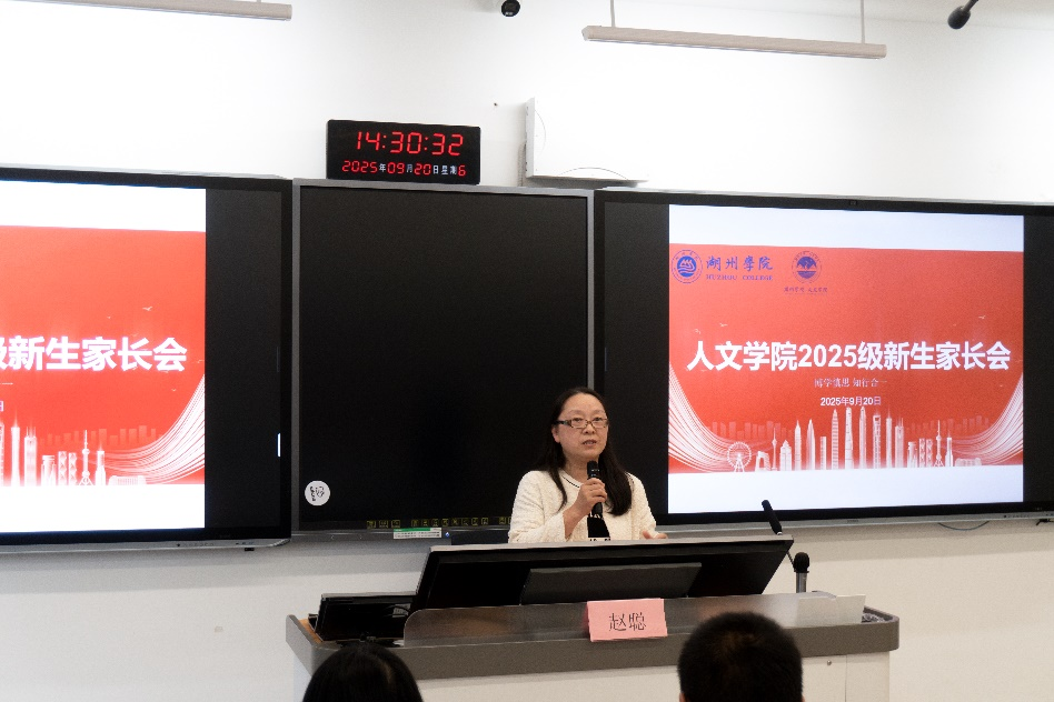 赵聪介绍了人文学院近年毕业生的就业及考研情况;提醒家长关注学生人身安全及财产安全、学业预警、心理健康以及职业规划等;同时呼吁家校保持与班主任及辅导员沟通联系,协同合作,共同助力学生成长。