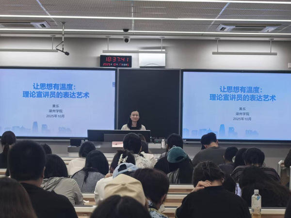 为提升支部党员理论宣讲能力,助力学生更好地传播先进思想,2025年10月17日晚上,人文学院学生第一党支部联合人文学院党建中心,成功举办题为《让思想有温度:理论宣讲员的表达艺术》专题讲座。本次讲座特邀湖州师范学院人文学院副院长、浙江省语言文字工作者协会副秘书长、硕士研究生导师、副教授黄乐担任主讲嘉宾,人文学院学生第一党支部全体党员、党建中心干部干事参加,学生第一支部书记葛玮主持。