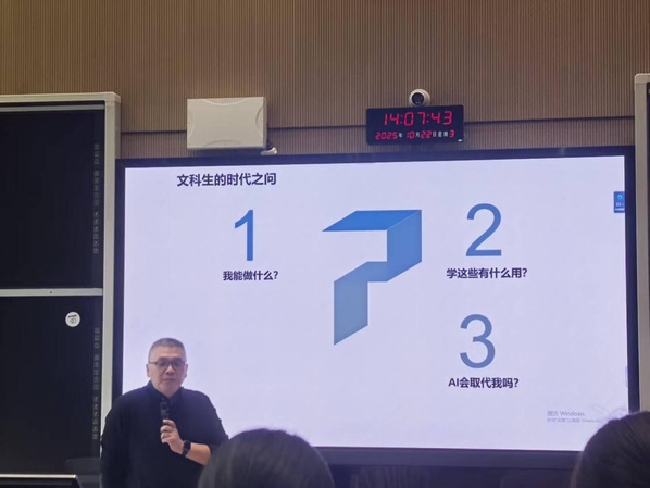 在提问环节中,学生们踊跃发言,围绕如何平衡人文素养与技能学习、数字化时代文科生的职业发展等问题,与王教授进行了深入交流。他强调,文科生应努力成长为“π型人才”:以深厚的人文底蕴为“一撇”,扎实的经世技能为“一捺”,跨界融合能力为连接之“一横”。他进一步提出具体建议,包括坚持深度阅读、学习统计学与Python等工具、主动融合分析的行动路线,助力文科生以感性共鸣结合理性洞察,从容应对时代挑战。