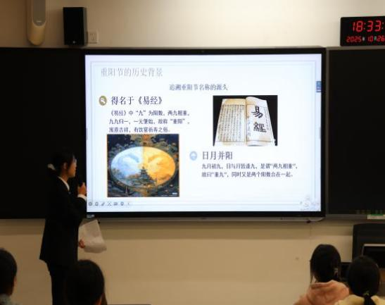 重阳节历史源远流长,其起源可追溯至先秦时期,最初与秋季丰收后的祭祀天帝和祖先活动相关,而在现代,“敬老”成为其核心意义。飞花令环节过后,宣讲团芮宁同学分享了自己听闻的重阳故事,带领同学们开启了一场关于温情延续的古今对话。同学们深刻体会到了重阳节“尊老敬亲”情感内核的传承与延续,进一步强化了对传统美德的认知与认同。
