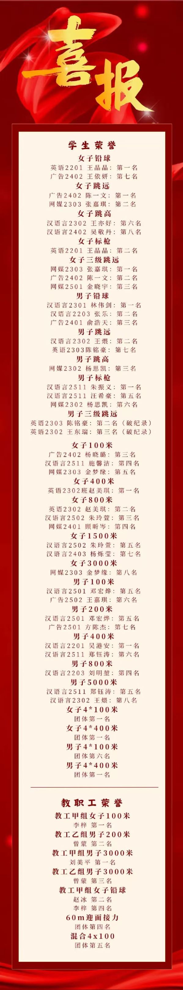 此次运动会人文学院参赛学生共计50人,参赛教师20人。回顾赛场的每一个瞬间:跑道上,人文运动员们如疾风,一路向前,用奔跑诠释青春的律动;田赛场上的每一次投掷与跳跃,都划出了力与美的最优弧线。雨水淋湿运动员们的衣衫,运动场上的温情与热血传递到了每个同学的心中!
