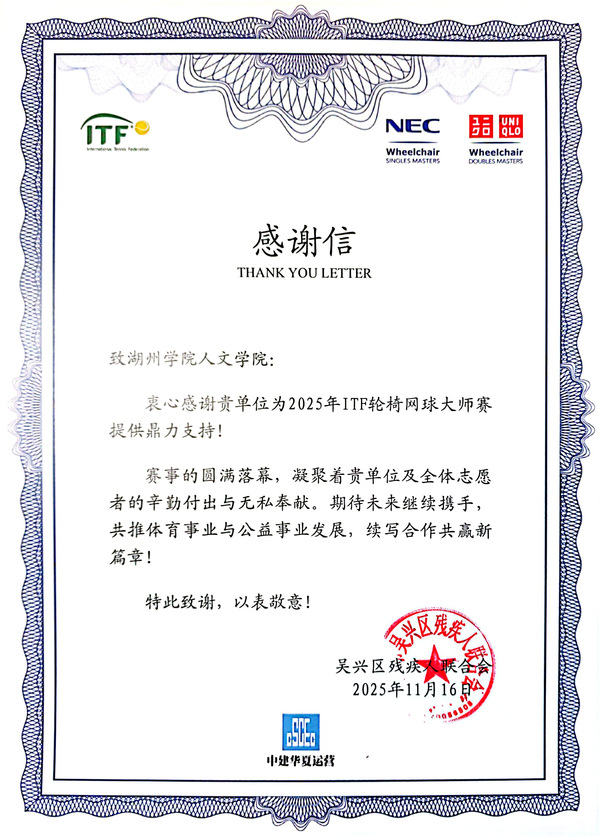 近日,人文学院收到吴兴区残疾人联合会发来的《感谢信》,信中对人文学院在2025年NEC轮椅网球单打大师赛期间的精心组织、鼎力支持,以及41名志愿者的辛勤付出与无私奉献致以诚挚谢意。