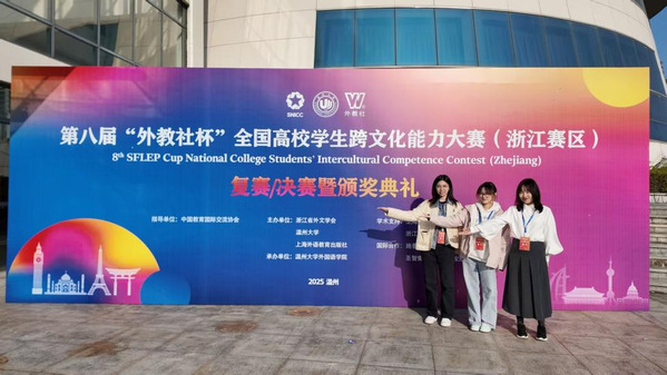 11月22日,第八届“外教社杯”全国高校学生跨文化能力大赛(浙江赛区)在温州大学举行。我院外语系杨晓璐、陈致欣、连婧如三位同学组成的参赛团队表现出色,荣获浙江省三等奖。