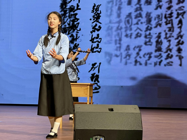 在比赛舞台上,人文学院代表队以“铁血柔情夏明翰”为主题,深情演绎了革命烈士夏明翰的三封绝笔家书。表演别出心裁,几名表演者分别化身夏明翰生命中三位重要的女性角色:大姐夏明玮、妻子郑家钧和母亲陈云凤。通过“大姐”的疼惜与理解、“妻子”的坚贞与不舍、“母亲”的悲痛与骄傲三段独白式诵读,以层层递进的演绎方式,深刻剖白出夏明翰就义前丰富而壮烈的内心世界。