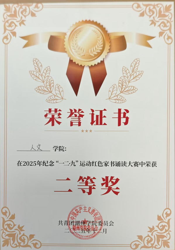 为纪念“一二·九”爱国学生运动,传承红色基因,赓续精神血脉,湖州学院隆重举办了“美丽中国·音火相传”红色家书诵读大赛。人文学院积极响应号召,精心组织队伍参赛,选派宣讲团成员黄晓雯,何溢佳,白芮宁,阮孟洁,彭莲春,陈佳欣参赛表演。成员们取得了优异的成绩,荣获二等奖。