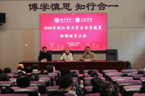 为迎接2026年浙江省大学生体质健康抽测,进一步激发学生参与体育训练的积极性与主动性4月8日下午,人文学院召开省体质健康抽测动员大会。人文学院党委副书记、纪委书记赵聪、学工办副主任葛玮、团学负责吕佶康出席会议,2023级抽测学生参加大会。